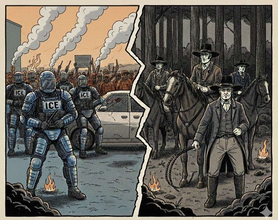On Instagram and TikTok, the content creator “Ashleytheebarroness” posted a powerful clip a few weeks ago in which she said that ICE isn’t like the Gestapo; they’re like slave catchers. Slave patrols were a powerful army of bounty hunters commissioned by southern state governments that ventured into border states in the era before the Civil War to catch escaped slaves; no trial, no habeas corpus. As brutal as those patrols were in the 1830s and 1840s, the Compromise of 1850 empowered them — making it almost impossible for northern states to prevent them from seizing anyone of a darker skin color — much as ICE has recently been empowered. “Gestapo says this could never be us; slave patrols say this is exactly us,” she explains, noting that slave patrols just needed law and validation. “Slave patrols force a deeper realization,” she continued. “What if the terror wasn’t imported? What if it was foundational? ICE is not a deviation, and it isn’t new … and once you see that, yeah, it’s an oh-shit moment.”